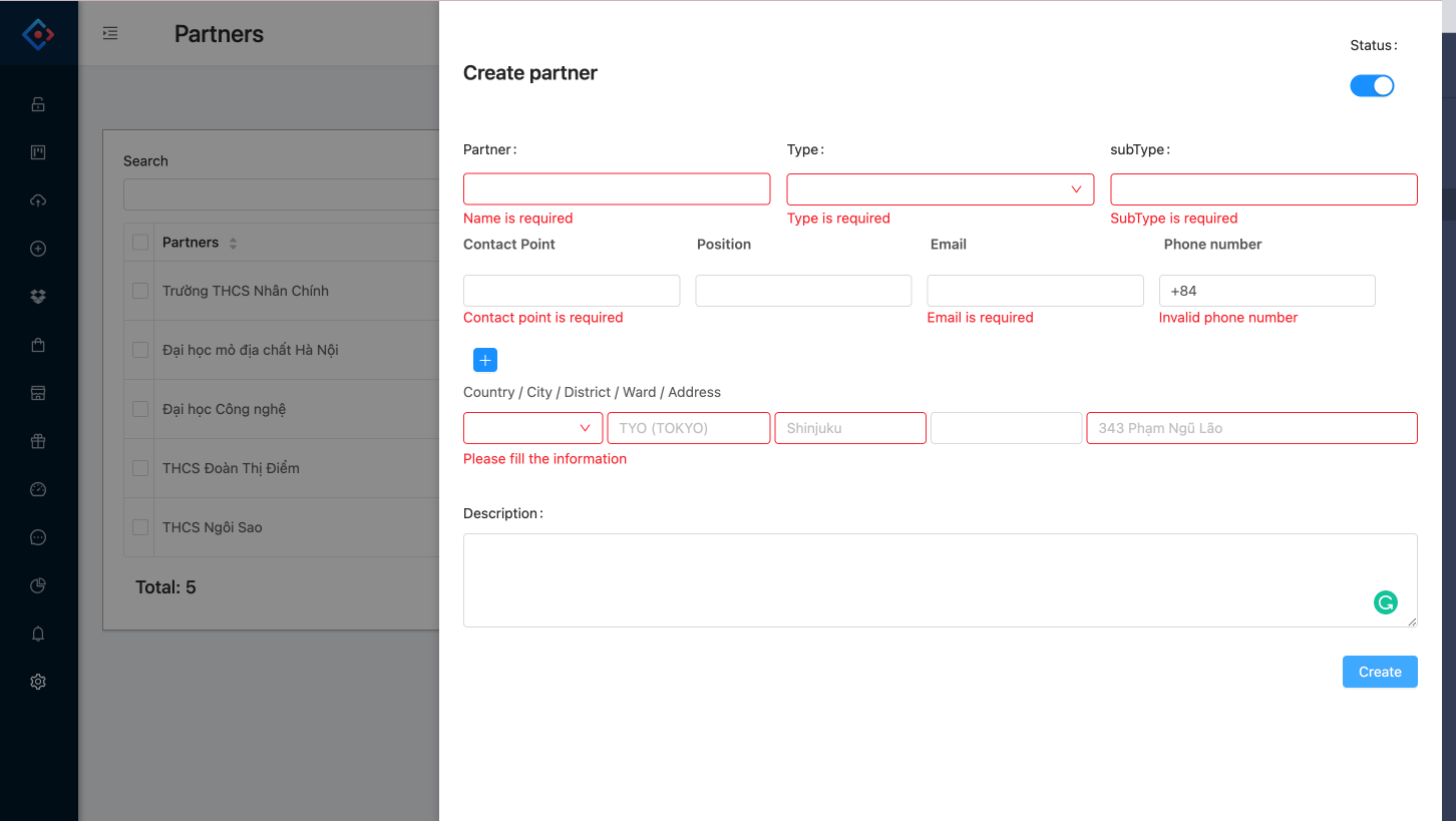 **g. Status:** trạng thái của đối tác (active/deactive), mặc định là active khi tạo.