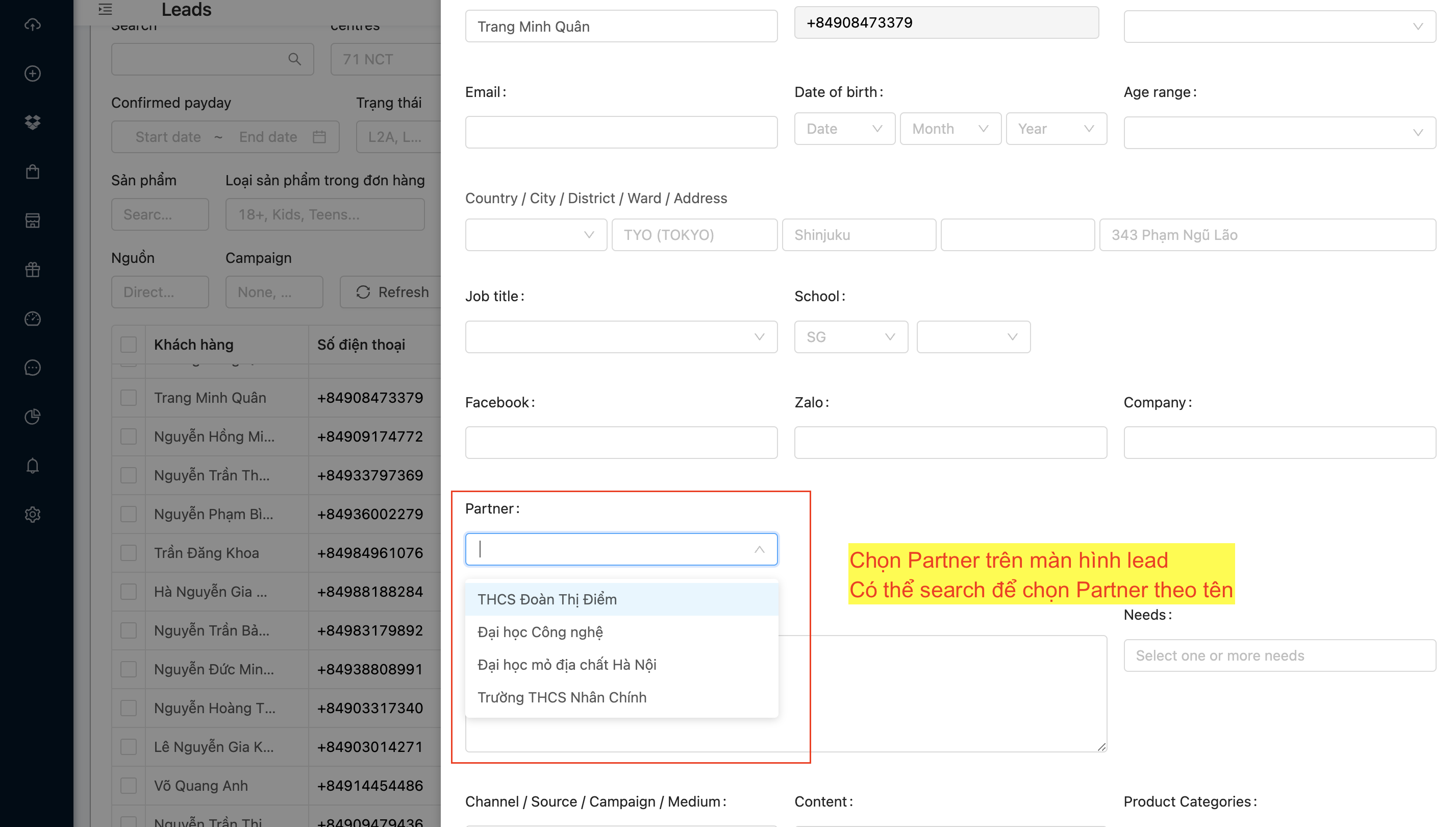 <figure><img src="https://3905273132-files.gitbook.io/~/files/v0/b/gitbook-x-prod.appspot.com/o/spaces%2FAAhtuog70InLzMdIx6Ua%2Fuploads%2FQay3AJX5gy8irXtL27f5%2FA%CC%89nh%20chu%CC%A3p%20Ma%CC%80n%20hi%CC%80nh%202023-03-09%20lu%CC%81c%2002.01.01.png?alt=media&#x26;token=c91b6761-f82a-4e32-bab0-4a56af65f0f4" alt=""><figcaption><p>Partner hiển thị trên màn lead tại Customer tab </p></figcaption></figure>