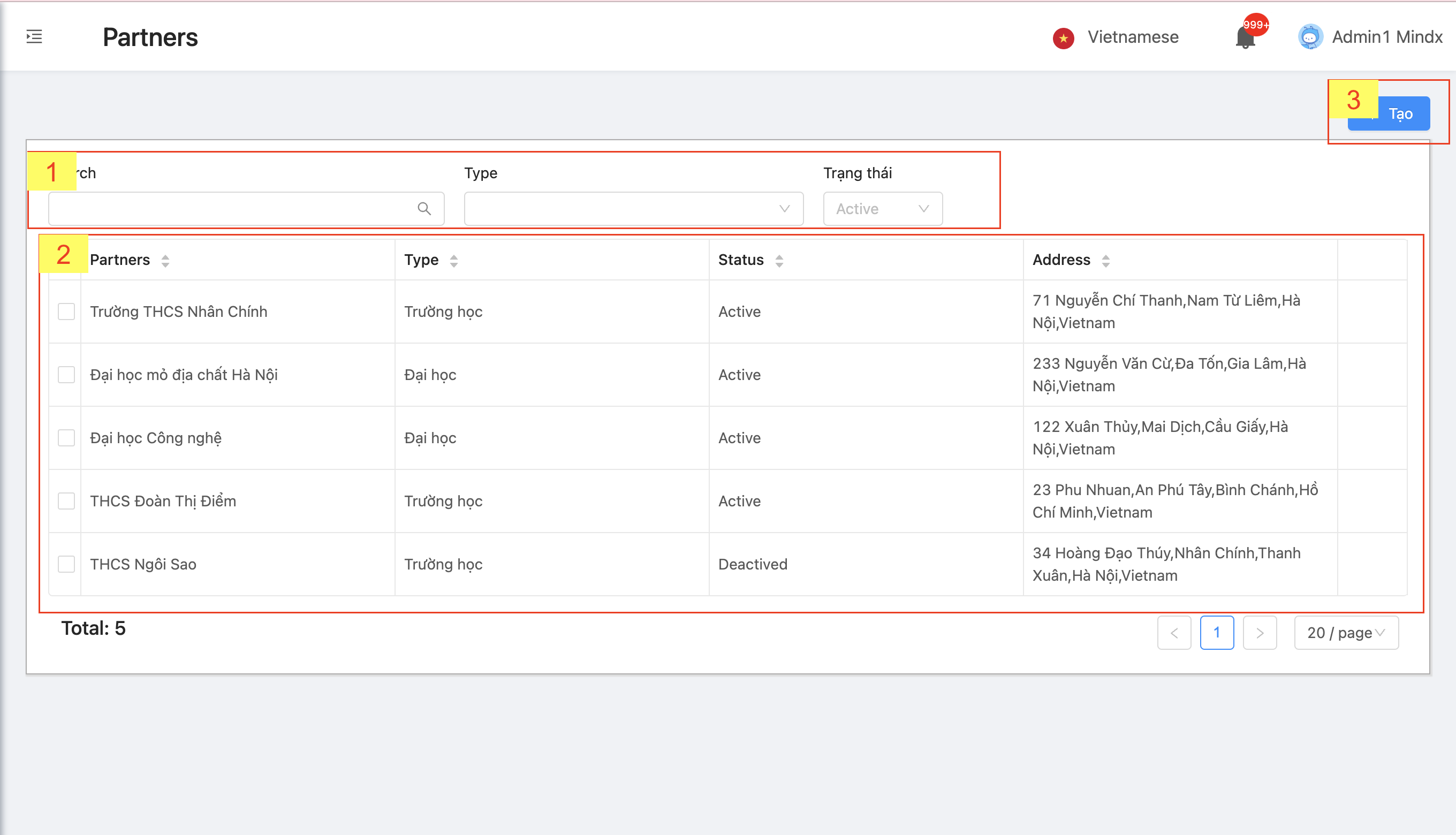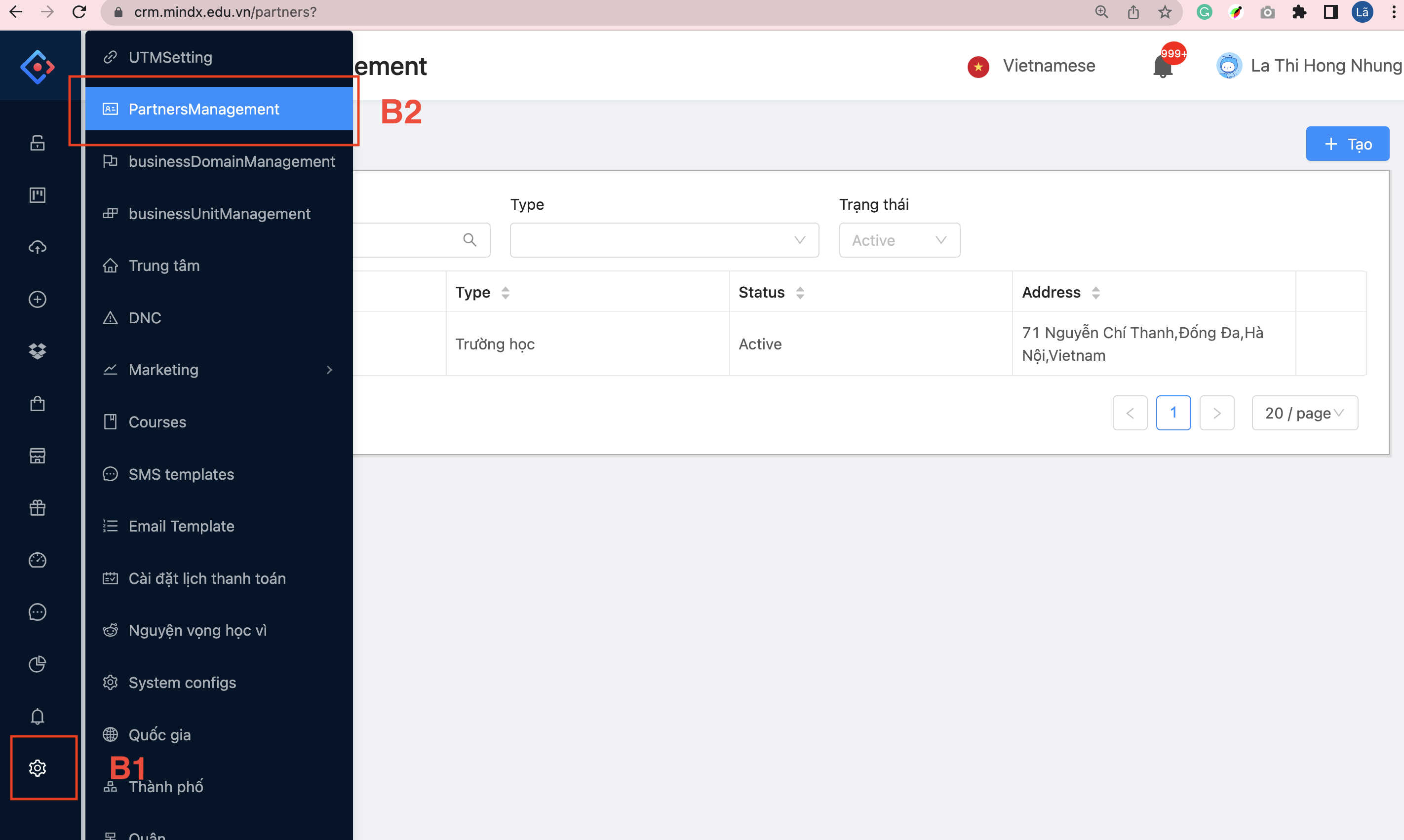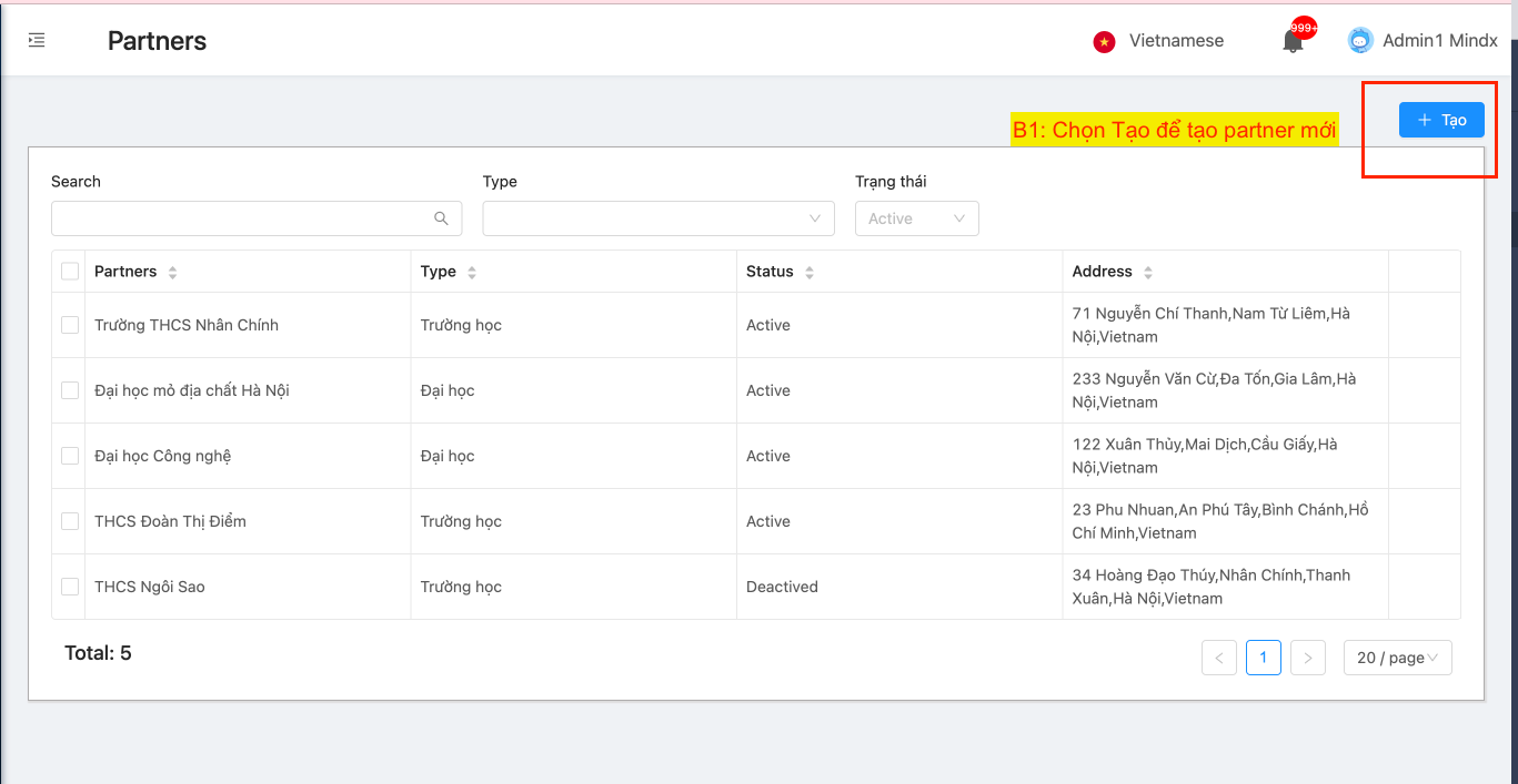 B1: Ấn vào nút Tạo trên màn hình Partner Management